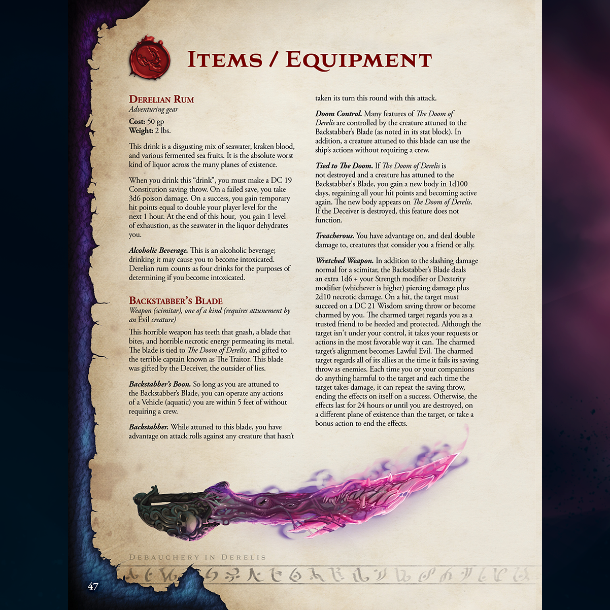 This supplement comes also brings a whopping 21 new items to your table, that are sure to bring the feelings of unease. Check out the Ship in a Bottle for any time your players have a need for a fully fledged pirate ship in a fix, and the Backstabber's Blade for loot that is sure to be memorable!